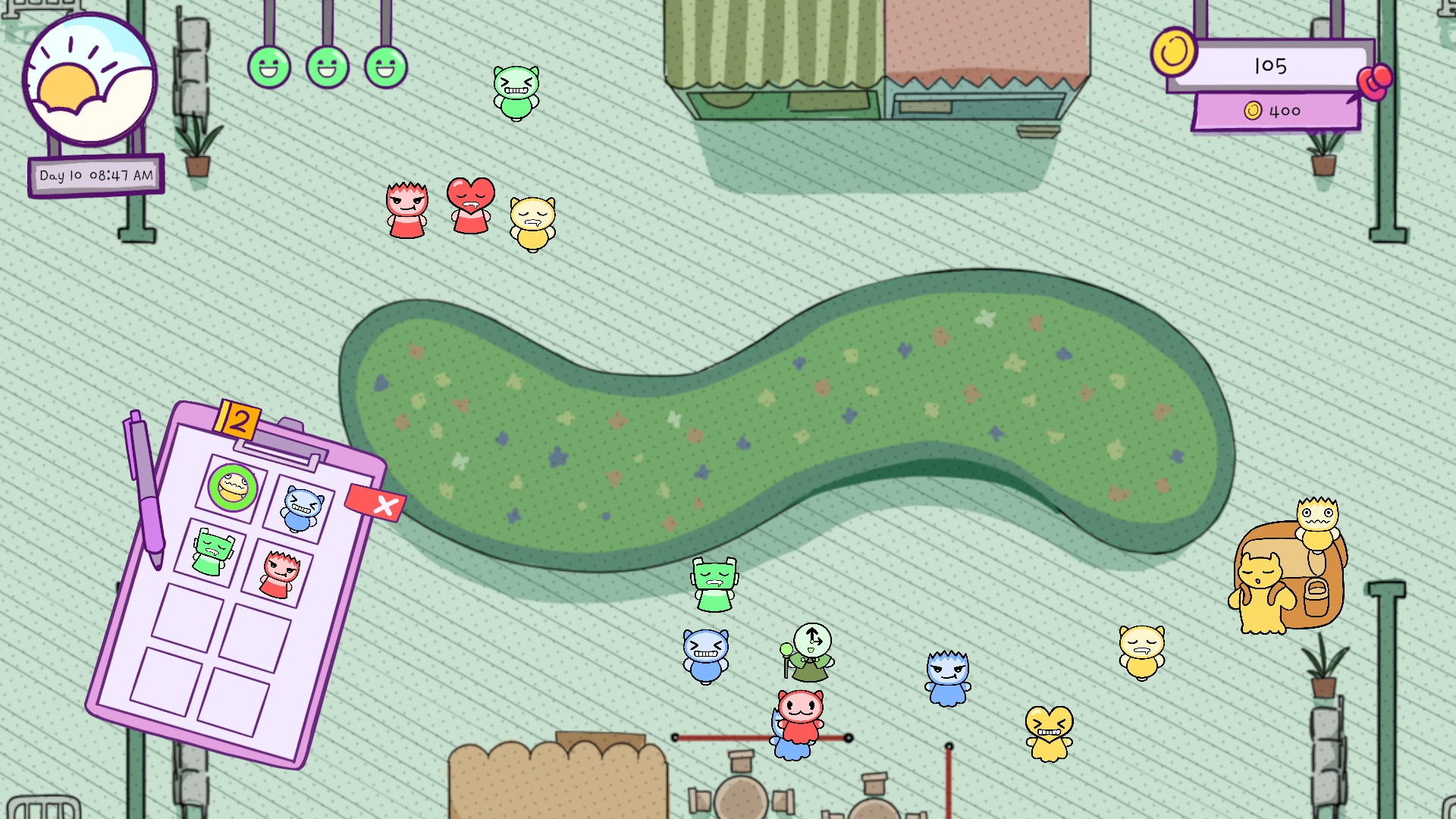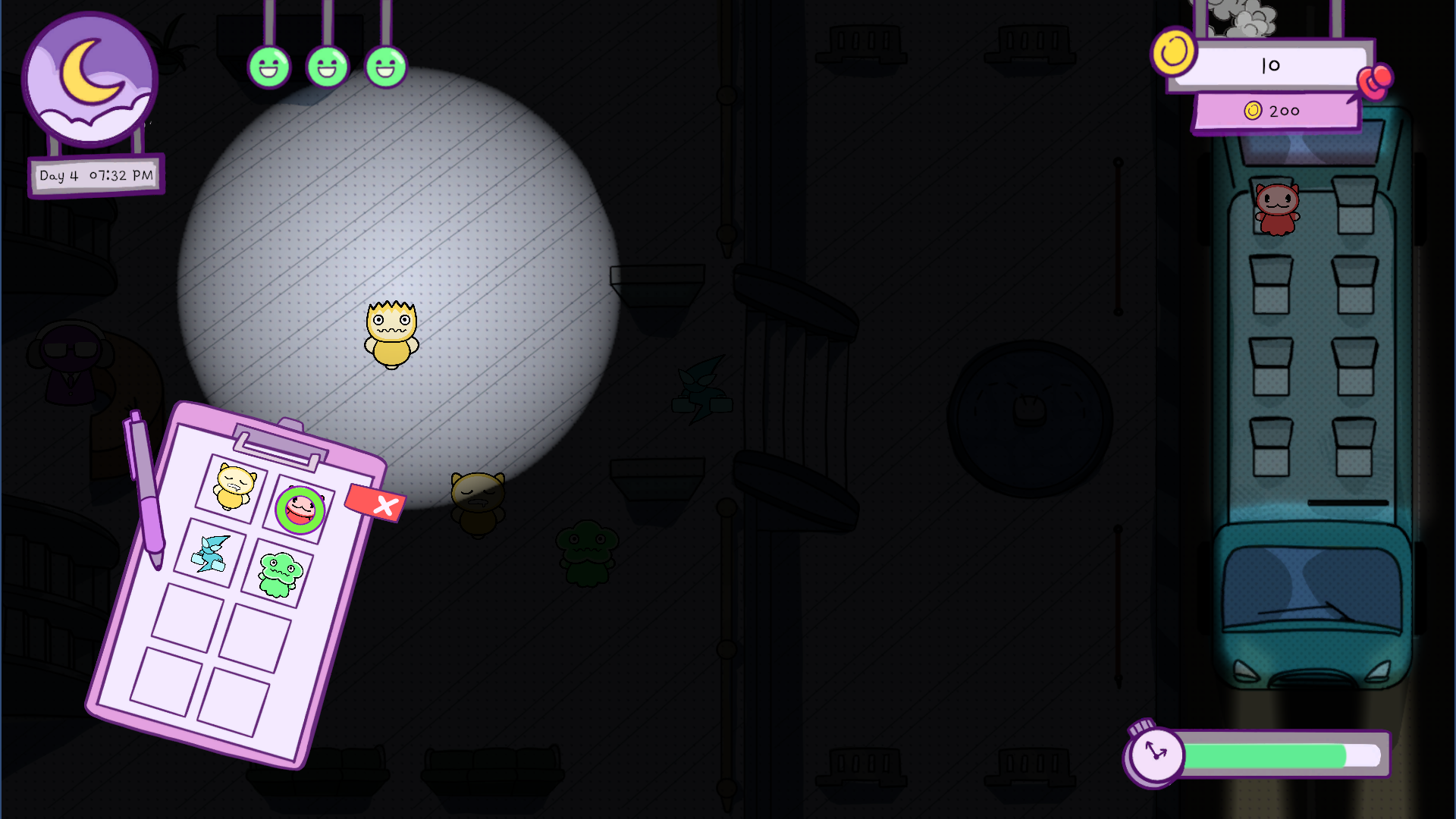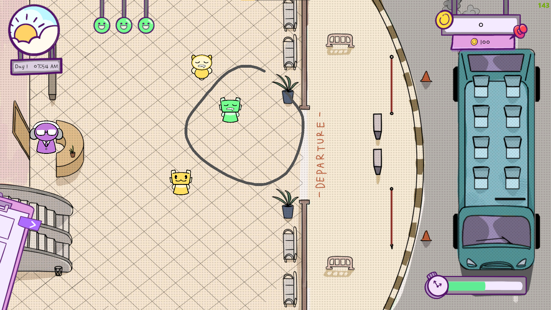 draw a lasso → catch NPC → send them to the bus!