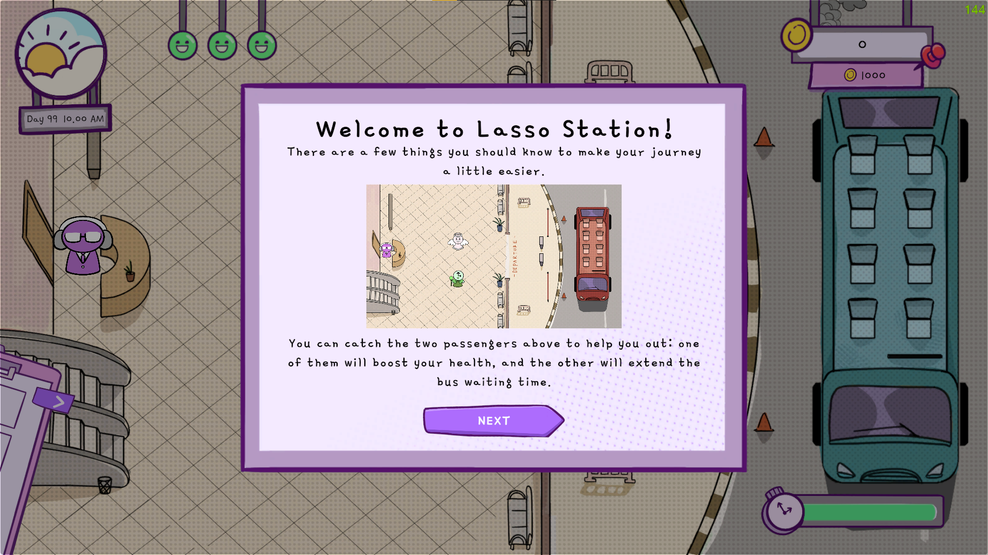 Each bus brings a list of passengers, while lots of NPCs wander around like confused little beans. Your mission? Catch the right ones before time runs out!